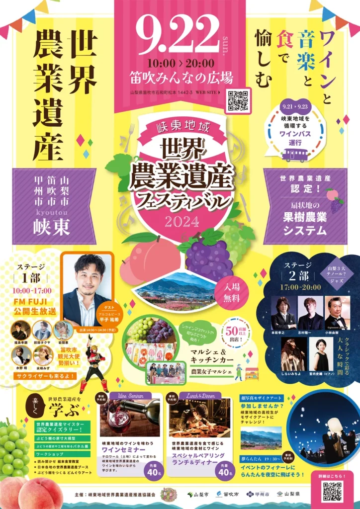 記念のイベント「世界農業遺産フェスティバル」今年は笛吹市で開催されます。※峡東地域(甲州市、山梨市、笛吹市)