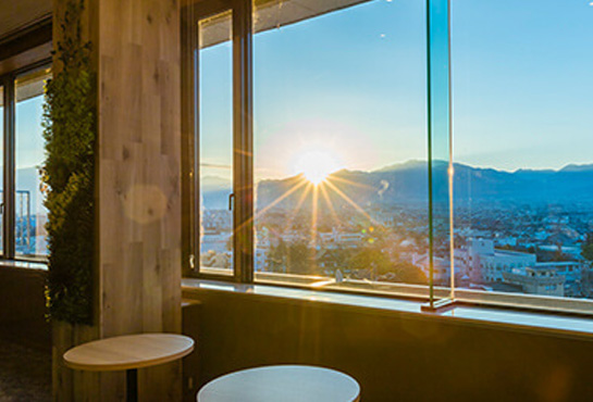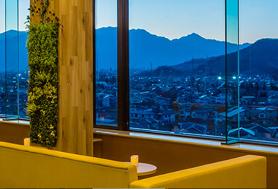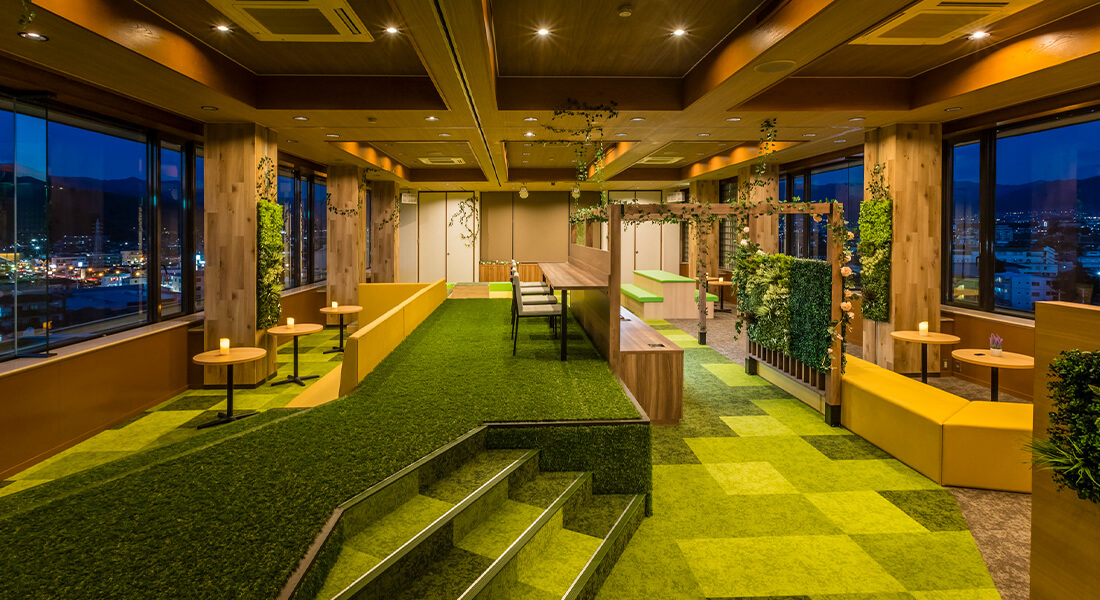人口芝が敷きつめられた「パークラウンジ春夏秋冬 -SHIKI-」では、公園にいるかのようにお寛ぎいただくことができます。ワインを楽しみながら、南アルプスをはじめとする甲州石和の眺望をご覧ください。