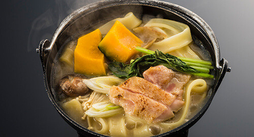 野菜や肉を多く入れて味噌で煮込んだ、山梨の郷土料理「ほうとう」。味噌と出汁にもこだわった逸品です。