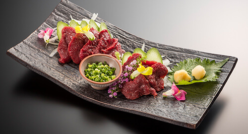 山梨で親しまれている、赤身に適度な脂が入った目にも美しい馬刺し。自家製タレと生姜などの薬味と一緒にお召し上がりください。