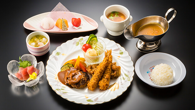 お子様は小学生用会席料理と幼児用お子様ランチ、食事のみ幼児用のキッズプレートのご用意がございます。メニューにより料金が異なります。