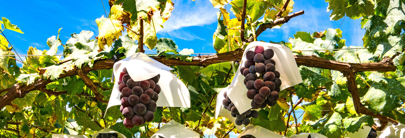 登美の丘ワイナリーは、南に富士山を仰ぎ、眼下に甲府盆地を望む土地に広がる自家ぶどう園です。ぶどう栽培に適した恵まれた気候・風土のもと、ぶどうを栽培・醸造し、瓶詰など一貫して行っています。