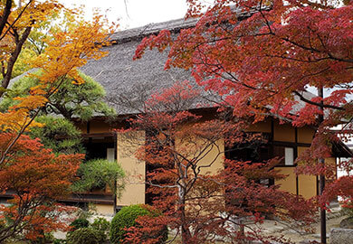 秋の紅葉の名所として有名な八田家書院。武田家家臣の八田氏の屋敷に残る、徳川家康より拝領した用材によって再構築した茅葺き入母屋造りの書院です。
