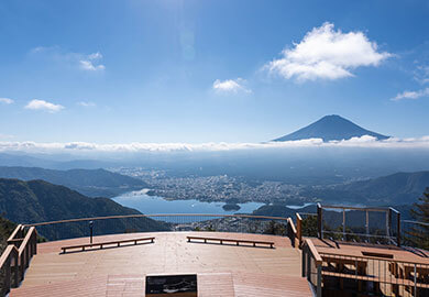 富士山が一望できる人気の絶景スポット"新道峠"に新設された展望デッキ。雄大な富士山の絶景を楽しめます。河口湖や山中湖、世界遺産に登録されている富士山が一望できる眺望スポットです。